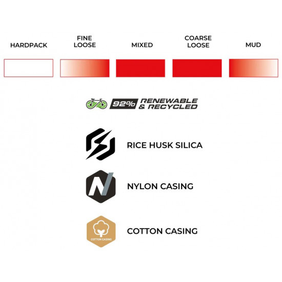 ECO RACE FORMULATION Next-generation compound blend developed specifically for competitive gravel racing, delivering exceptional speed and grip across varied terrain. Renewable and recycled ingredients include Fair-Rubber certified natural rubber, soybean oil and rice husk ash silica.