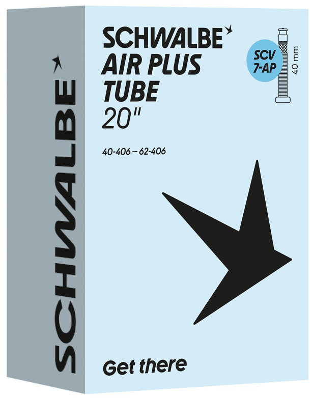 Schwalbe AIR PLUS bicycle inner tube no. 7-AP. For bicycle tires in the size 20" inch (ETRTO 40/62-406). Holds the air even longer thanks to wall thickness even longer. Less frequent re-inflation necessary. Also protects above-average protection against punctures.