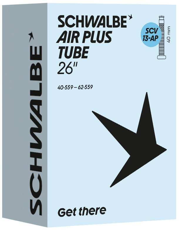 Schwalbe AIR PLUS bicycle inner tube no. 13-AP. For bicycle tires in the size 26" inch (ETRTO 40/62-559). Holds the air even longer thanks to wall thickness even longer. Less frequent re-inflation necessary. Also protects above-average protection against punctures.