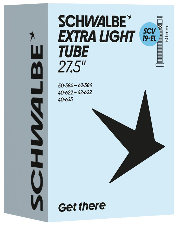 Schwalbe EXTRA LIGHT bicycle inner tube no. 19-EL. For bicylce tires in 27.5"/28"/29" inch (ETRTO 50/62-584, 40/62-622, 40-635). Lower weight, with the same reliability as a Schwalbe standard inner tube.