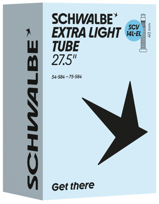 Schwalbe EXTRA LIGHT bicycle inner tube no. 14L-EL. For bicylce tires in 27.5" inch (ETRTO 54/75-584). Lower weight, with the same reliability as a Schwalbe standard inner tube.