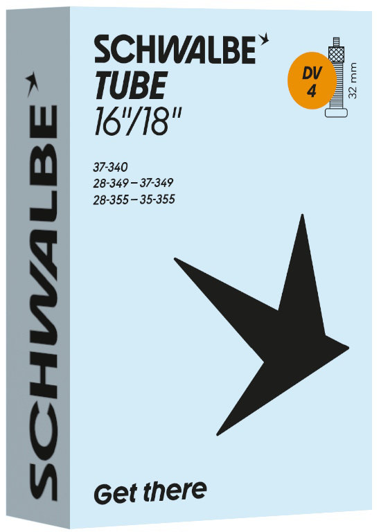 Schwalbe standard bicycle inner tube no. 4. For bicylce tires in 16"/18" inch (ETRTO 37-340, 28/37-349, 28/35-355). Retains air for an above-average length of time. Thanks to the best material quality and uniform wall thickness. Maximum reliability that has proven itself millions of times over.