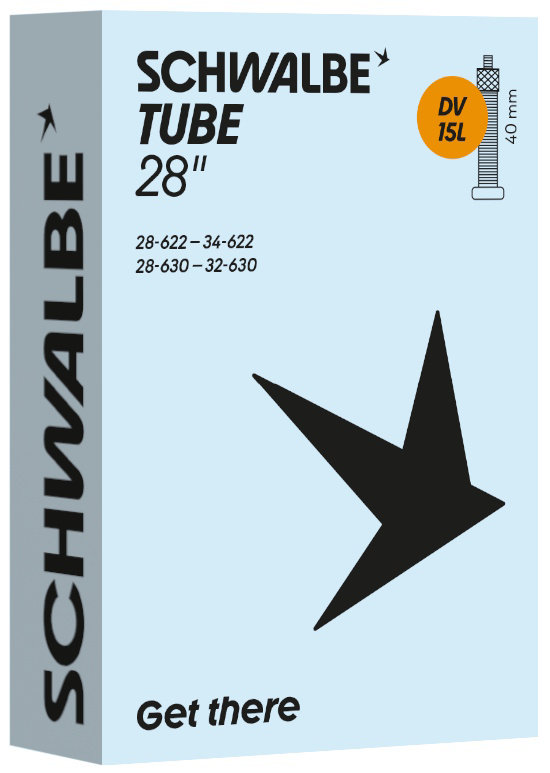 Schwalbe standard bicycle inner tube no. 15L. For bicycle tires in size 28" inch (ETRTO 28/34-622, 28/32-630). Holds air for an above-average length of time. Thanks to the best material quality and uniform wall thickness. Maximum reliability that has proven itself millions of times over.