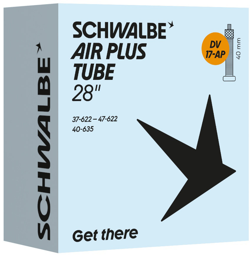 Schwalbe AIR PLUS bicycle inner tube no. 17-AP. For bicycle tires in the size 28" inch (ETRTO 37/47-622, 40-635). Holds the air even longer thanks to wall thickness even longer. Less frequent re-inflation necessary. Also protects above-average protection against punctures.