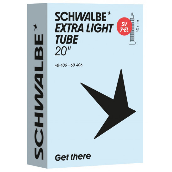 Schwalbe EXTRA LIGHT bicycle inner tube no. 7-EL. For bicylce tires in 20" inch (ETRTO 40/62-406). Lower weight, with the same reliability as a Schwalbe standard inner tube.