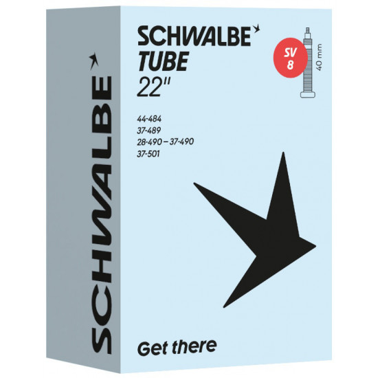 Schwalbe standard bicycle inner tube no. 8. For bicylce tires in 22" inch (ETRTO 44-484, 37-489, 28/37-490, 37-501). Retains air for an above-average length of time. Thanks to the best material quality and uniform wall thickness. Maximum reliability that has proven itself millions of times over.