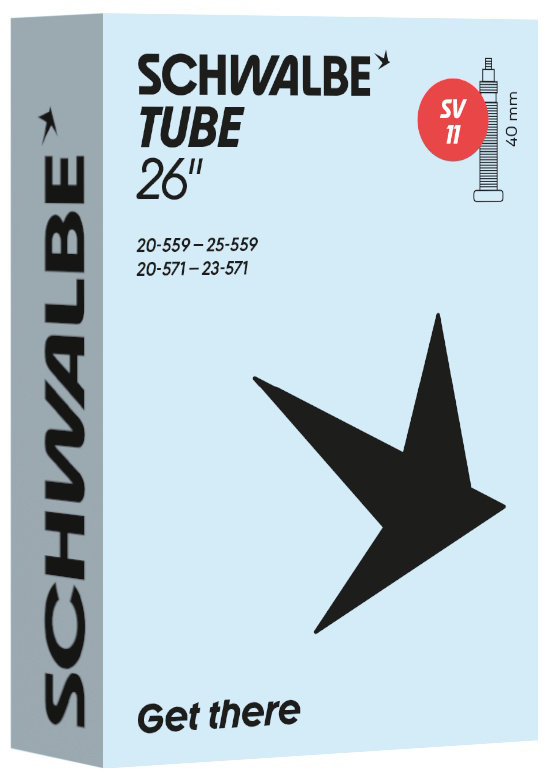 Schwalbe standard bicycle inner tube no. 11. For bicylce tires in 26" inch (ETRTO 20/25-559, 20/23-571). Retains air for an above-average length of time. Thanks to the best material quality and uniform wall thickness. Maximum reliability that has proven itself millions of times over.