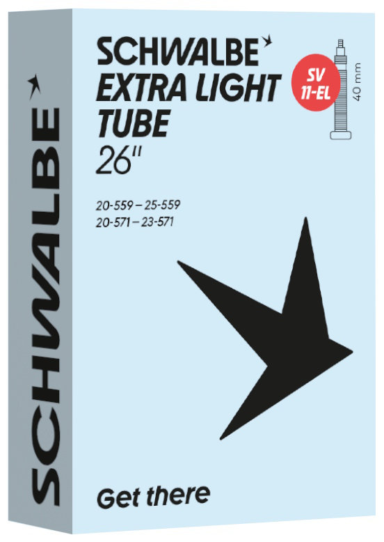 Schwalbe EXTRA LIGHT bicycle inner tube no. 11-EL. For bicylce tires in 26" inch (ETRTO 20/25-559, 20/23-571). Lower weight, with the same reliability as a Schwalbe standard inner tube.
