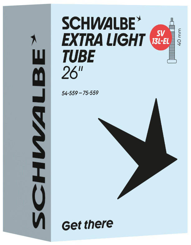 Schwalbe EXTRA LIGHT bicycle inner tube no. 13L-EL. For bicylce tires in 26" inch (ETRTO 54/75-559). Lower weight, with the same reliability as a Schwalbe standard inner tube.