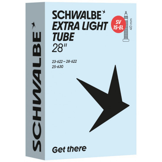 Schwalbe EXTRA LIGHT bicycle inner tube no. 15-EL. For bicylce tires in 28" inch (ETRTO 23/28-622, 25-630). Lower weight, with the same reliability as a Schwalbe standard inner tube.