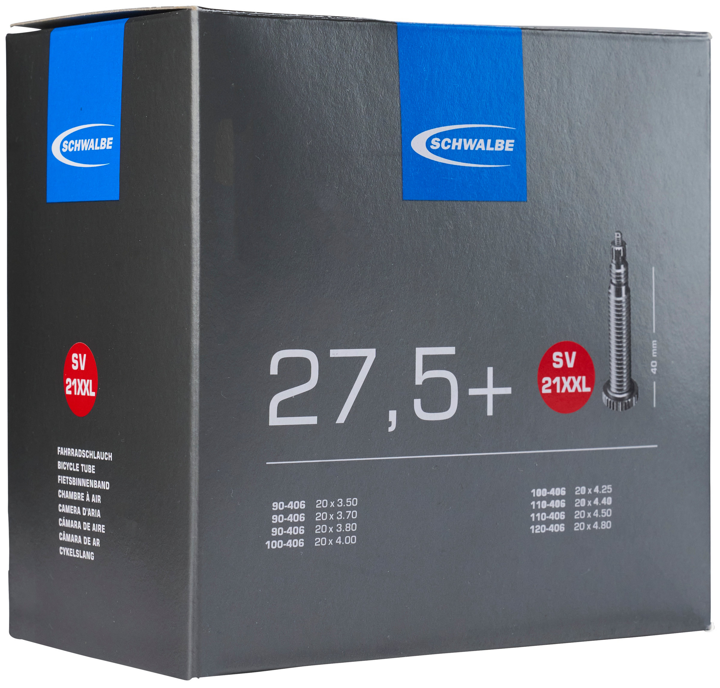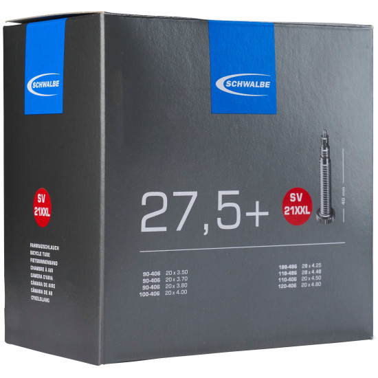 The Schwalbe SV21XXL is a bike tube with an Presta valve. The quality is top-notch and the Schwalbe tube is made of synthetic butyl rubber with a composition that provides maximum flexibility and good air retention. The bike tube comes in a weight of 420 grams and is thoroughly tested according to Schwalbe's high quality standards.