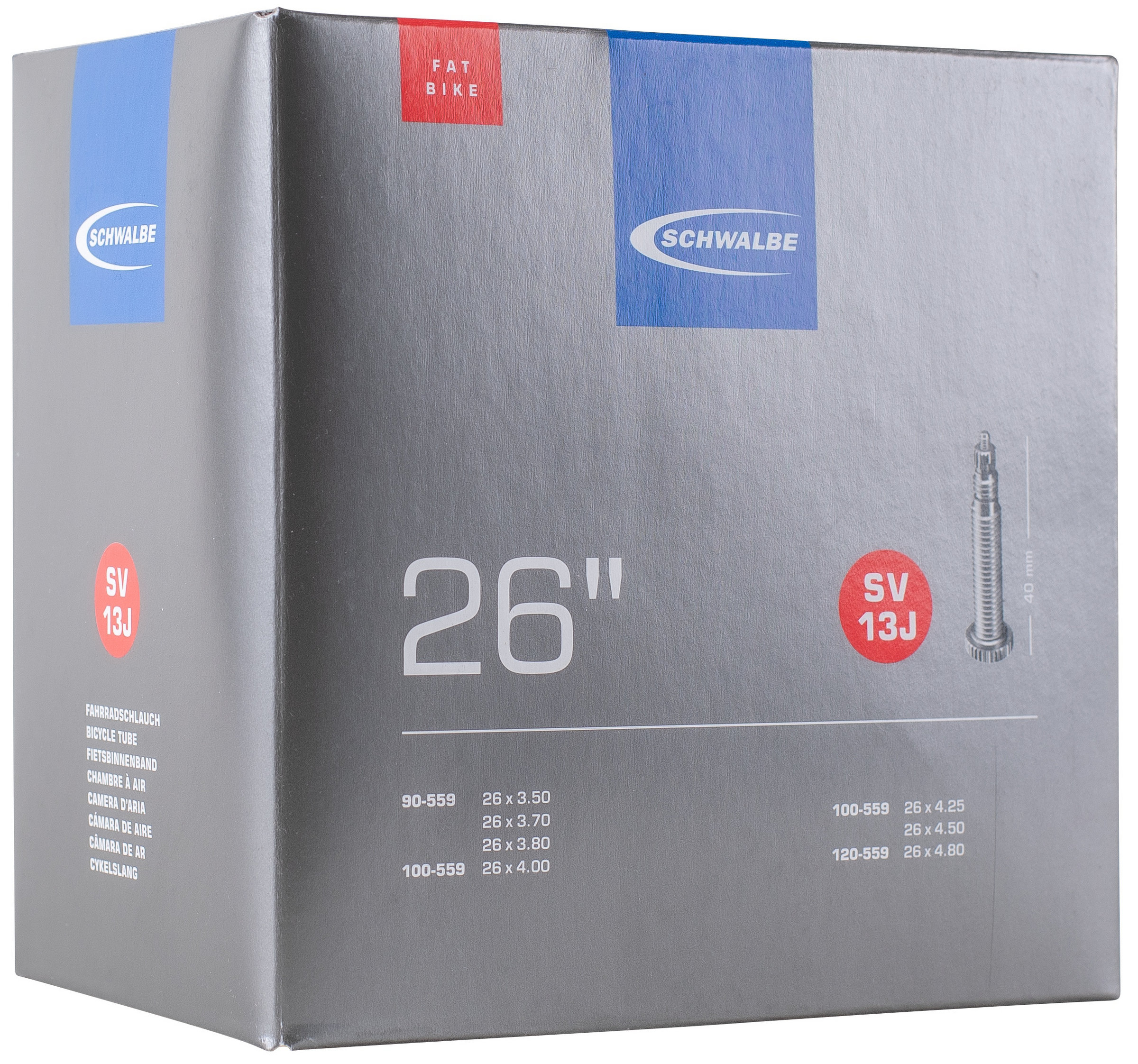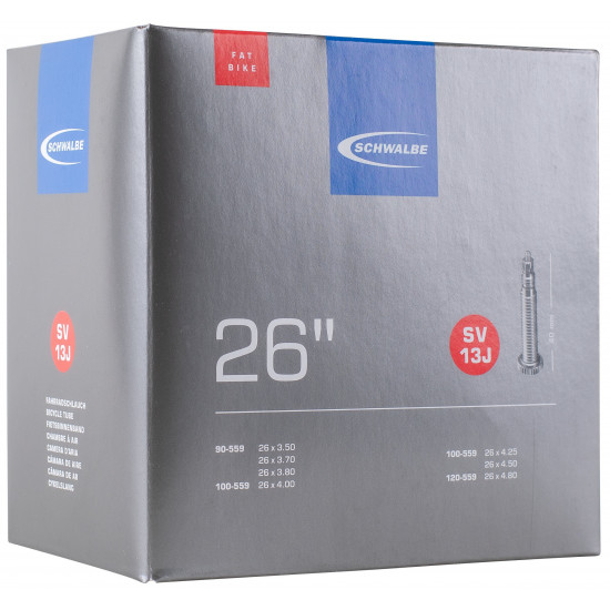 Schwalbe standard bicycle inner tube no. 13J. For bicycle tires in size 26" inch (ETRTO 90/120-559). The Schwalbe inner tube especially for fat bikes, with huge volume. For fatbike tires up to 120 mm wide. Retains air for an above-average length of time. Thanks to the best material quality and uniform wall thickness. Maximum reliability that has proven itself millions of times over.